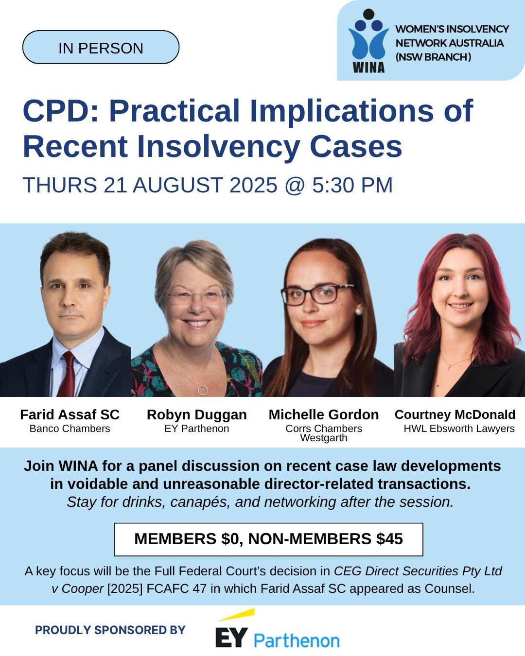 Join us for a panel discussion on recent case law developments in voidable and unreasonable director-related transactions, with a key focus on the Full Federal Court’s decision in CEG Direct Securities Pty Ltd v Cooper [2025] FCAFC 47. Drinks, canapés, and networking to follow the session.